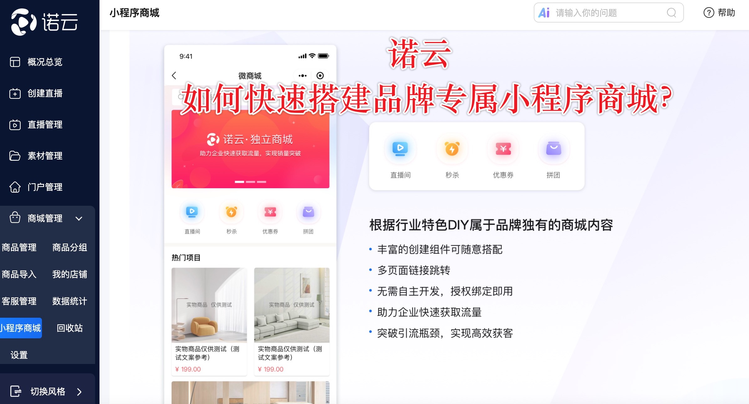 从首页风格、商品陈列到直播入口设置,均可可视化配置。完成搭建后提交审核,通过即可正式发布上线。整个流程简化了技术门槛,让企业能更专注于内容运营与用户服务,快速实现“直播+商城”一体化经营。...